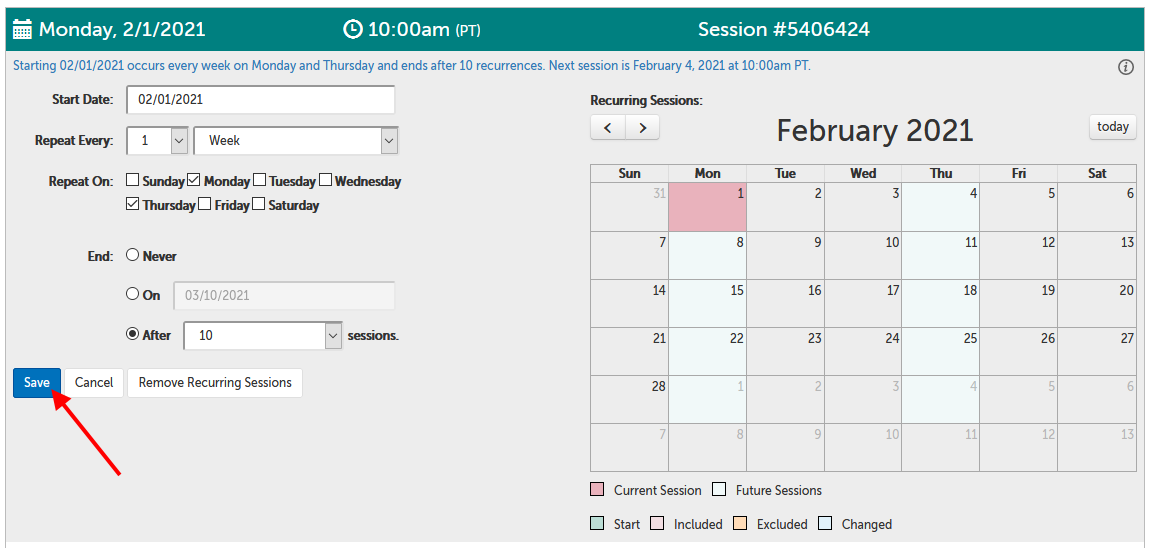 - Start Date: The default start date will be the date of the current session. This can be edited if you would like recurring schedule to use a different start date instead.