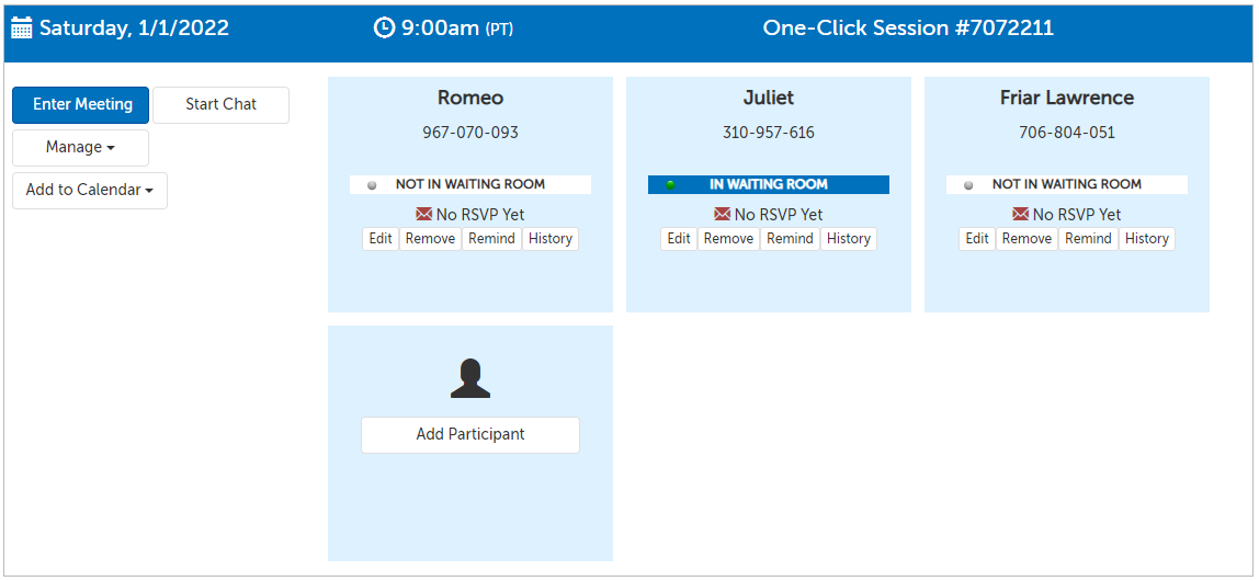 By default, if your participants join a session before you arrive, they would be able to see and interact with another. Additionally, if you invited a participant and they arrive late, they would be able to use their invite to enter the session when they are able to attend. However, if you would like to make sure that no participant can enter the session without being specifically allowed by you, you can enable the One-Click Waiting Room. (For instance, if you wanted to be able to speak privately with one participant before letting another in, or if you want to be sure that your participants cannot see one another before you arrive.)
