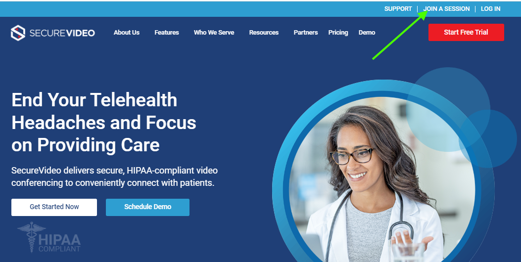1. Your host should have provided you, the session invitee, with a 9-digit Access Code for the session you want to join. Go to the SecureVideo website and use the Join a Session button in the upper right-hand corner of the page.