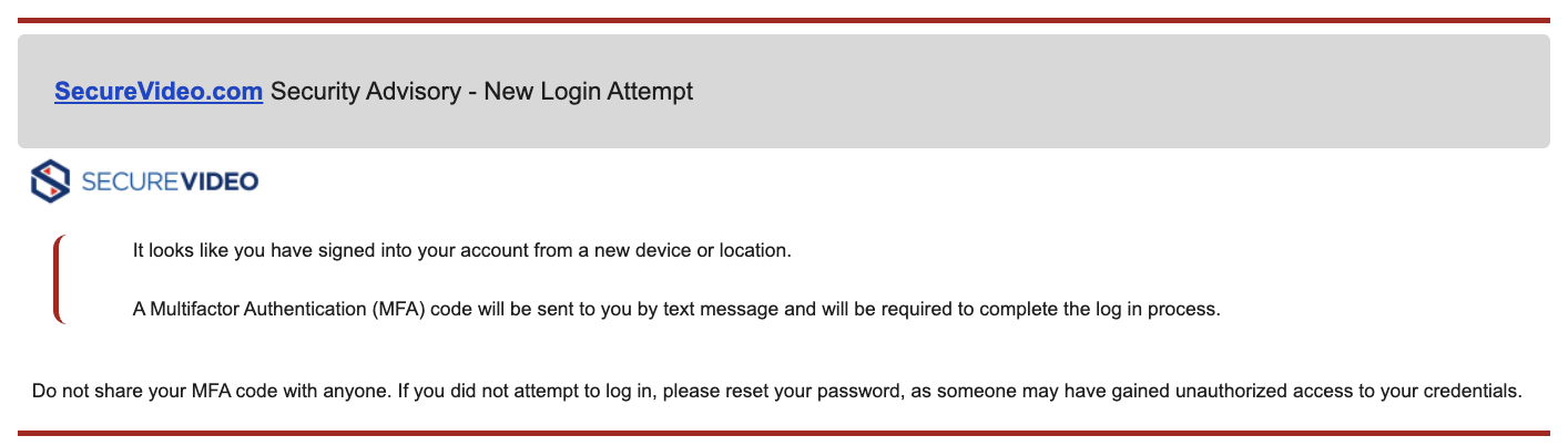 If the risk threshold was met by a login attempt, a notification email is automatically sent to alert the user. The email will be sent from [email protected] with the subject "New Login Attempt", and it will look similar to this: