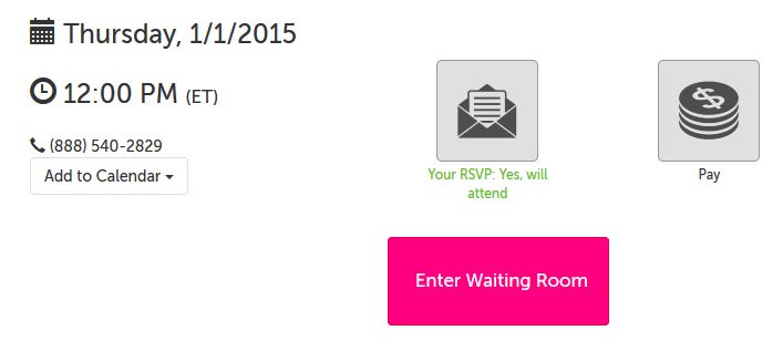 • Primary Buttons Background: Primary buttons are the buttons someone is most likely to use on a given page. (Example below: Primary Buttons Background set to pink. This image is from the waiting room page, but Primary Buttons appear on nearly every page within your SecureVideo account.)